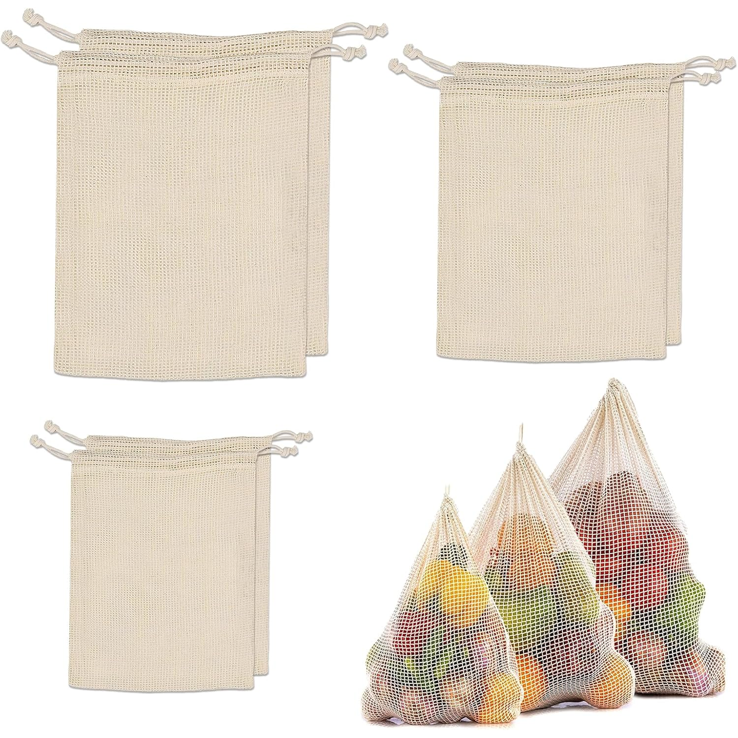 Juego de 6 bolsas de malla reutilizable de algodón orgánico (3 Tamaños/Beige).