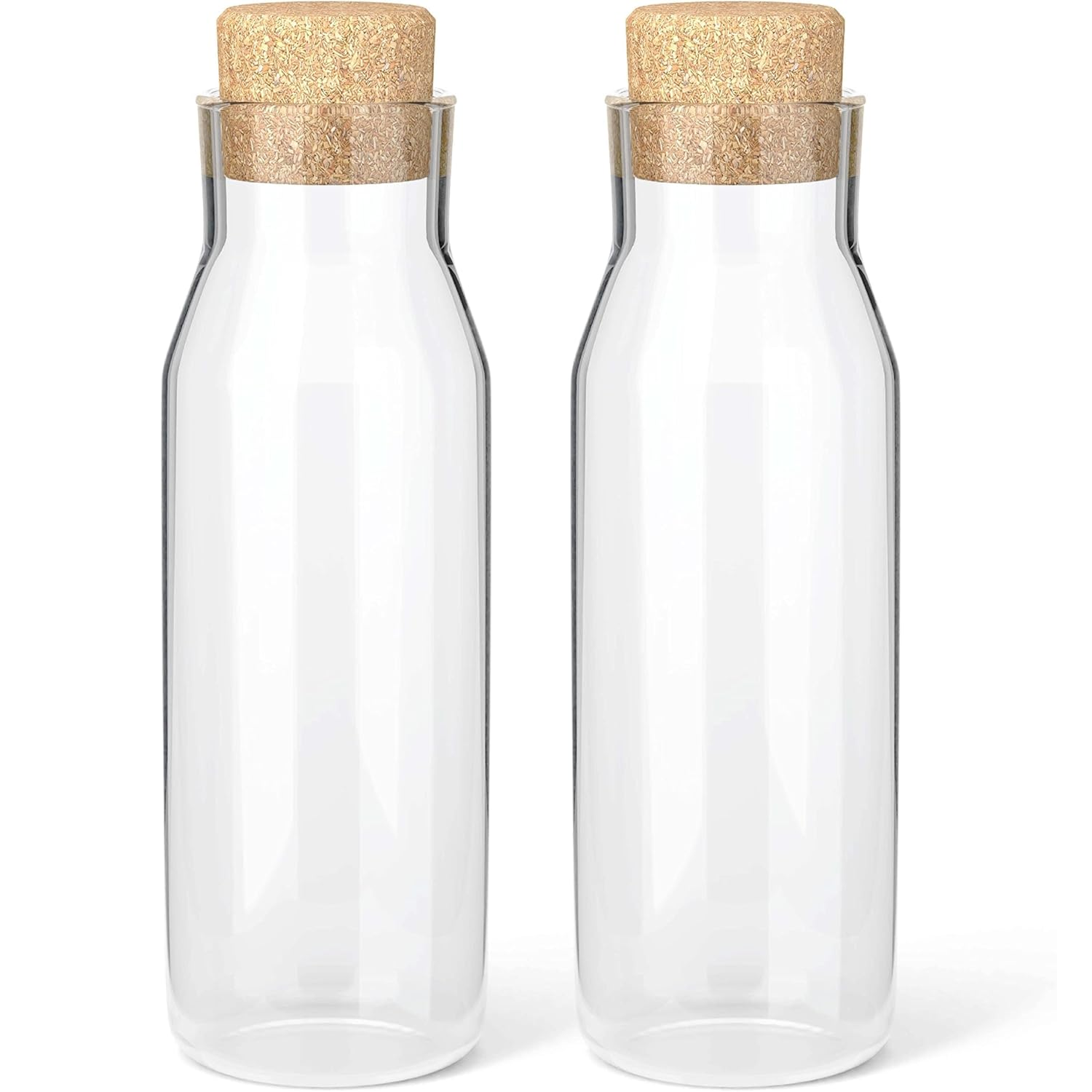 - 2 botellas de cristal de 1 litro con tapones de corcho. El diseño delgado de la botella significa que cabe perfectamente en la puerta del frigorífico o en una estantería de almacenamiento, y la apertura ultra ancha permite innumerables recargas sencillas.